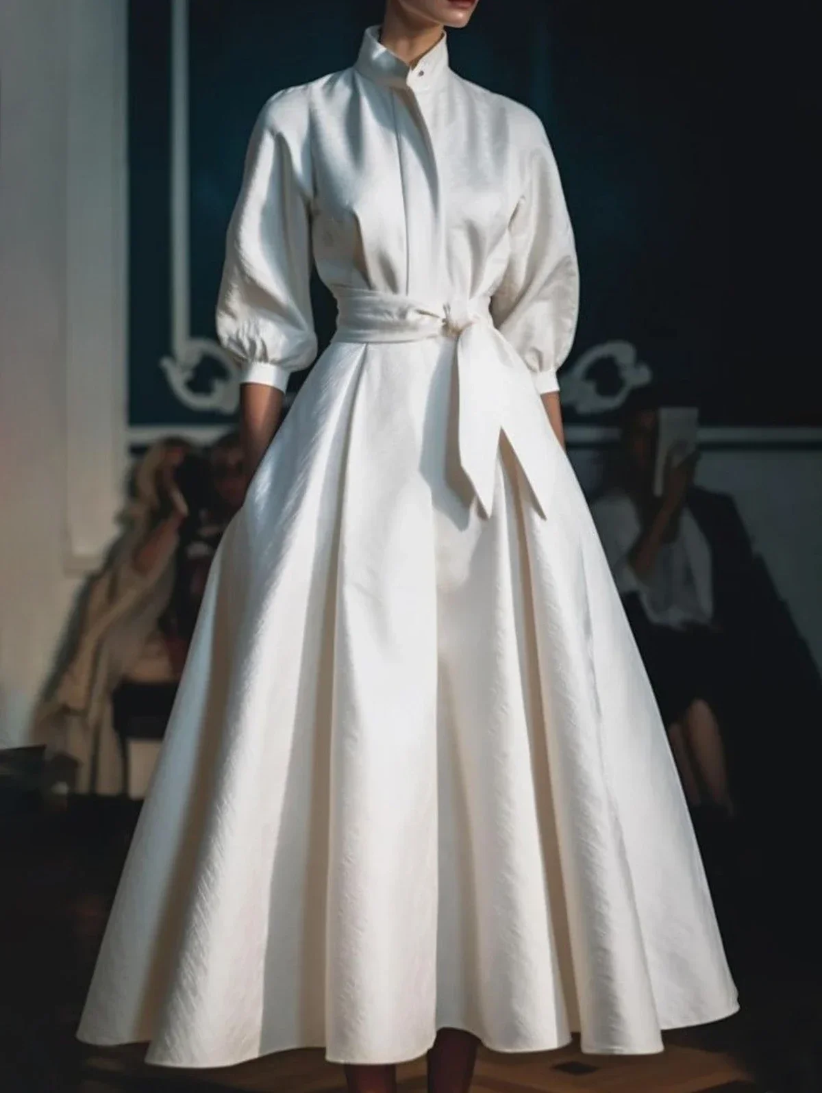 Elegant Women Shirt Dress Long Sleeve Stand Collar Minimalist A-Line Pleated Wedding Guest Long Maxi Dresses with Blet