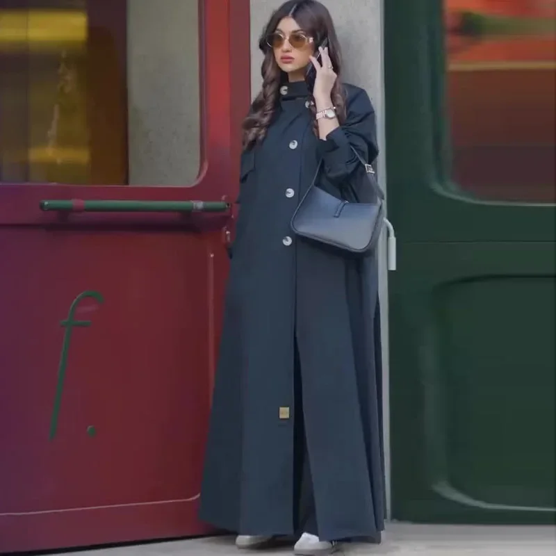 Muslim Abaya Women Trench Coat Morocco Overcoat England Retro Motorcycle Jacket Dubai Long Outerwear Eid Ramadan Saudi Arab 2025