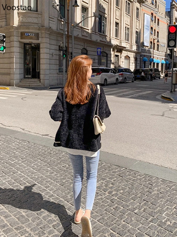 White Mink Cashmere Sweater Coat Women Autumn Winter Lazy Style Korean Retro Black Loose O-Neck Knitted Cardigan Fashion Outwear